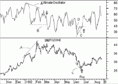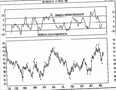 На следующем рисунке показаны графики курса акций Compaq и 14дневного индикатора легкости движения вместе с его 9дневным скользящим средним. Стрелки «покупка» и «продажа» нанесены на график в местах, где скользящее среднее индикатора пересекает нулевой уровень.