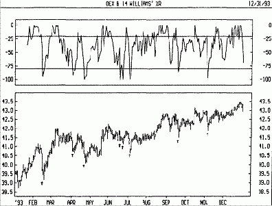 Простейший метод торговли на основе системы направленного движения предполагает сравнение двух индикаторов направленности 14дневного +DI и 14дневного DI. Для этого либо графики индикаторов наносятся один на другой, либо +DI вычитается из DI. У.Уайлдер предлагает покупать, если +DI поднимается выше DI, и продавать, когда +DI опускается ниже DI.