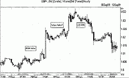 Примерно так и развивались события по британскому фунту в июне 1999 года, с той лишь разницей, что речь шла о понижении ставок. К этому времени Банк Англии (Bank of England, ВОЕ) уже несколько раз понижал процентные ставки и публично заявлял, что слишком высокий курс фунта является причиной снижений; деловой цикл в Англии находился в стадии снижения, как предполагалось, близи нижнего уровня, и по экономическим данным было видно, что слишком сильный фунт наносит ущерб британским экспортным отраслям. Кроме того, с начала 1999 года активно обсуждались перспективы вхождения Англии в Европейский Экономический и финансовый союз (Economic and Monetary Union, EMU); считалось, что оно должно состояться достаточно скоро, причем фунт должен войти в евро на уровне, существенно более низком, чем тот, где он торговался весной 1999 (помните 1992-й!). Поэтому давление на фунт книзу было сильным и длительным. Когда же ВОЕ 10 июня понизил свою ставку рефинансирования с 5,25% до 5,0%, то после короткого отката вниз внутри одного часа, фунт довольно энергично пошел вверх (Рис. 5.2.). Разумеется, потом все встало на свои места, тем более что рынок тогда ожидал повышения процентных ставок по доллару (которое и состоялось 2 июля), так что процентный дифференциал должен был измениться не в пользу фунта.