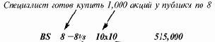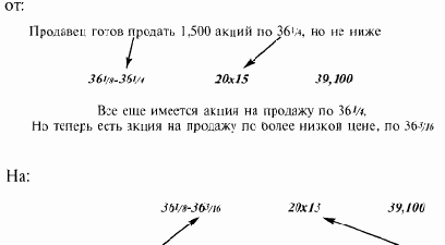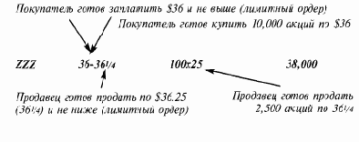 Так и создается рынок. Наибольший бид (36) и наименьший аск (36 1/4) - устанавливают параметры. Говоря языком торговли, рынок ZZZ — бид 36, аск 36 1/4, 10,000 к 2,500. Рынок от 36 до 36 1/4 известен как бид-аск спрэд.