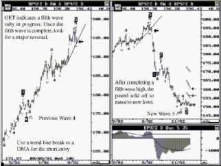- Примените DMA (Displaced Moving Average, Смещённая Скользящая Средняя), чтобы продать на пересечении. DMA – это простая скользящая средняя, смещённая вправо. Пока моментум рынка продолжает своё развитие, DMA пребывает в неподвижном состоянии. Когда цена проходит пик Пятой Волны, она может пробить (пересечь) DMA. Это будет подтверждением для открытия позиции, а также гарантией установления определённых стоп-сигналов над максимальными ценами.