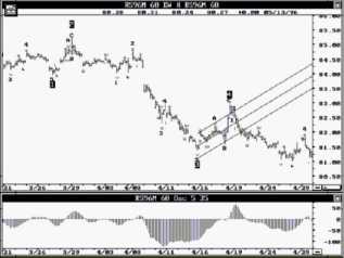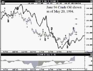 Примечание к графику: Цена на Сырую Нефть с апреля 94 до 3 февраля 1994Главный максимум был установлен в пределах нескольких дней около 21 октября 1993Сезонная Модель свидетельствует об установлении новой минимальной цены в марте 94.Осциллятор подтверждает завершение Четвёртой Волны.