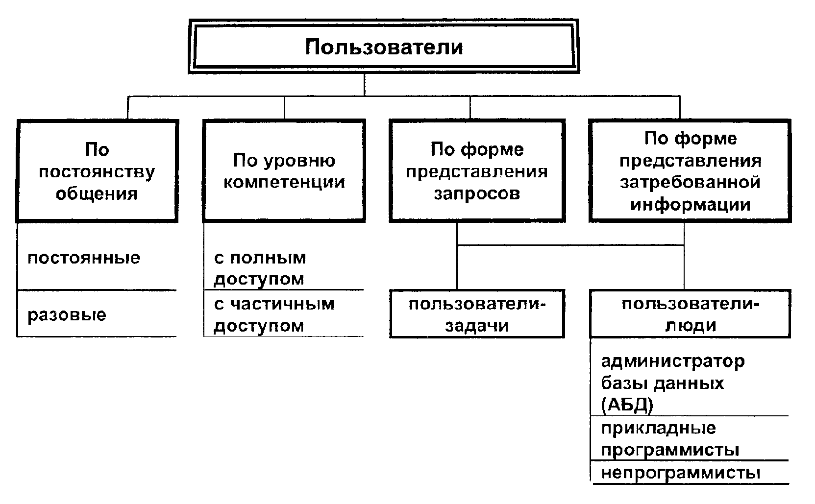 Администратор базы данных – человек (или группа лиц), имеющий полное представление об одной или нескольких базах данных и контролирующий их проектирование и использование. Отвечает за состояние базы данных в организации (учреждении) на протяжении ее жизненного цикла. Функциями АБД являются [12, 17]:– решение вопросов организации данных об объектах предметной области и установлении связей между этими данными с целью объединения информации о различных объектах; согласование представлений пользователей;
