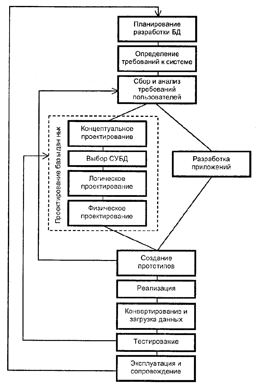Учитывая специфику разработки приложения базы данных, можно специфицировать этапы, представленные на рис.2.1 [7]. Общепризнанным является тот факт, что указанные этапы не являются строго последовательными, а подразумевают повторы предыдущих этапов с помощью циклов обратной связи. Процесс разработки БД является итеративным, предполагает многократные возвраты и анализ полученных результатов с целью максимально адекватного описания предметной области. На рис.2.1 показаны наиболее очевидные циклы обратной связи, и их множество не является окончательным.