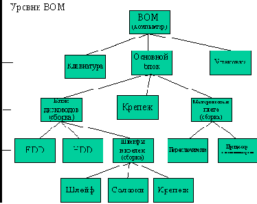 Изделия, производимые в ходе такого рода сборочных операций, стали представляться в виде древовидных конструкций, получивших обобщающее название BOM (bill of material - в русском языке нет столь же общего эквивалента, есть проблемно-зависимые аналоги, такие как "состав изделия", "рецептура", "сборочная спецификация", ввиду этого далее будем использовать оригинальный термин).