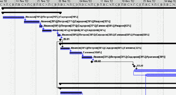 Для изменения даты начала и окончания задач нужно навести мышь па середину отрезка, чтобы курсор принял форму креста с четырьмя стрелками, и перетащить ее вправо или влево1. Чтобы увеличить или уменьшить длительность задачи, нужно подвести курсор к правому краю отрезка, чтобы он принял вид полосы со стрелкой вправо, и перетащить край отрезка вправо или влево. А если подвести курсор к левому краю задачи, то он примет вид полосы со знаком процента, и перетаскивая его можно определить процент выполнения задачи.