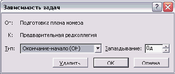 Для связи задач друг с другом достаточно навести курсор на середину отрезка исходной задачи и, когда он примет вид креста со стрелками, потащить курсор к другой задаче. По мере продвижения курсора за ним будет тянуться линия («связь») — ее нужно «бросить» на отрезок задачи, с которой связывается исходная. Редактировать связь можно с помощью диалогового окна, открывающегося после двойного щелчка на связи (рис. 5.22). В раскрывающемся списке Туре (Тип) можно выбрать тип связи, а в счетчике Lag (Запаздывание) — временной интервал между связанными задачами. Кнопка Delete (Удалить) удаляет связь.
