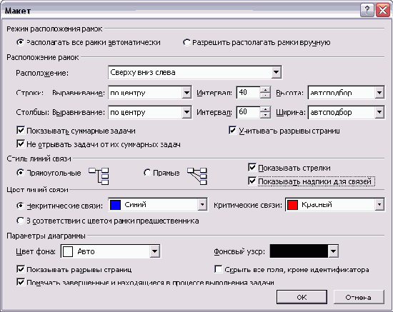 Сетевой график фактически представляет собой таблицу, в ячейках которой расположены блоки (при этом границы ячеек таблицы не отображаются). Параметры отображения блоков внутри этой таблицы и связи их друг с другом определяются в диалоговом окне Layout (Макет) (рис. 6.11), вызываемом командой меню Format > Layout (Формат > Макет) или при помощи команды Layout (Макет) в контекстном меню графика.