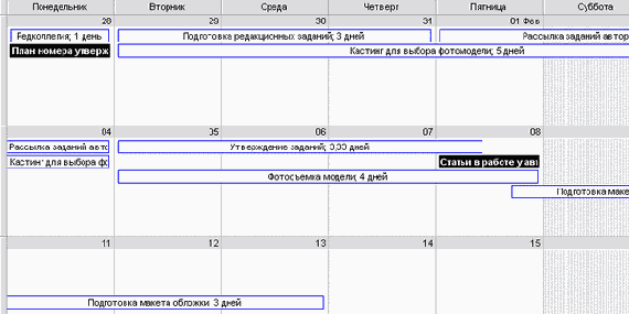 Блоки графика могут быть сориентированы относительно друг друга в зависимости от даты начала работ. В таком случае график делится на колонки, соответствующие единице измерения (день, неделя, месяц), и тогда задачи, начинающиеся в один и тот же момент (день, неделю, месяц), будут находиться в одной колонке. Размер блоков с длительностью задач при этом не соотносится.