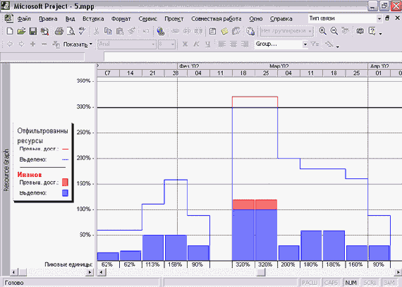 На рис. 9.3 (файл 2.mрр) светлые столбцы обозначают работу ресурса над выделенной задачей, а темные — работу над всеми остальными. При этом столбцы ресурсного графика распложены под соответствующими отрезками диаграммы Ганта.