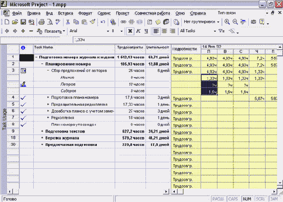 Благодаря такой связи составляющих комбинированного преставления с его помощью можно просматривать данные в разнообразных срезах. Например, па рис. 9.3 в комбинированном представлении диаграмма Ганта совмещена с ресурсным графиком (файл 2.mрр). На ресурсном графике можно просматривать информацию о работе любого из ресурсов, задействованных в выделенных на диаграмме Ганта задачах, причем работа над выделенными задачами отображается особым цветом.