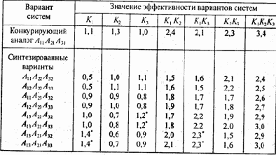 В табл. 5.24 для синтезированных решений приведены рассчитанные значения их эффективности (Эc) по всем единичным критериям качества, их парным и тернарным сочетаниям. Там же даны значения эффективности по соответствующим критериям для конкурирующего объекта (А11А21А31).