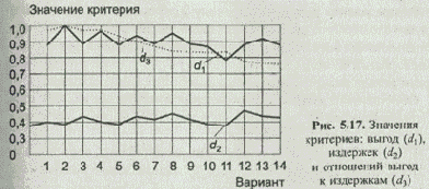 Здесь VВ, VИ — значения выгод и издержек для т-го целостного решения, каждая альтернатива Аij которого охарактеризована экспертными значениями vijB, vijИ (в частности, значениями нормированного вектора приоритета альтернатив по критерию качества);