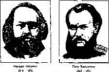 Идеи Бакунина образовались в той же интеллектуальной среде, что и идеи Штирнера. Бакунин принадлежал к русской дворянской семье и служил в армии. В 1834 г. в возрасте 20 лет он вышел в отставку в офицерском чине и посвятил себя изучению философии. Он, так же как Штирнер, Прудон и Маркс, испытал на себе влияние Гегеля. В 1840 г. он отправился в Берлин, где в продолжение четырех лет участвовал в идейном движении молодых радикалов, о которых мы говорили выше. С1844 по 1847 г. мы встречаем его в Париже, ще он проводит иногда целые ночи в спорах с Прудоном. Последний оказал на Бакунина глубокое влияние. В писаниях русского анархиста часто можно встретиться с простым развитием идей Прудона, излагаемых в том или ином из его произведений, например в "Idee generate de la Revolution au XIX s." ("Общая идея революции в XIX в."). 1848 г. указывает этому великому дворянину — дилетанту на его истинное призвание — призвание революционера. Он последовательно принимает участие в пражском восстании, в саксонской революции в Дрездене. Арестованный и дважды осужденный на смертную казнь в Саксонии и в Австрии, он был выдан России и заключен в Петропавловскую крепость, ще от цинги у него выпали все зубы. Сосланный в Сибирь в 1857 г., он совершает оттуда в 1861 г. удачный побег, отправляется в Лондон, а потом отдается революционной пропаганде в Швейцарии, в Италии и даже во Франции, где он пытается во время войны 1870-1871 гг. вызвать народное восстание (в Лионе). Бернард Лазарь изображает его "лохматым великаном с огромной головой, казавшейся еще больше от взъерошенной шевелюры, и нечесаной бороды", спящим в одежде и в сапогах, не имеющим ни крова, ни отечества и всегда готовым идти, как апостол, всегда в пути, ежечасно и ежедневно.