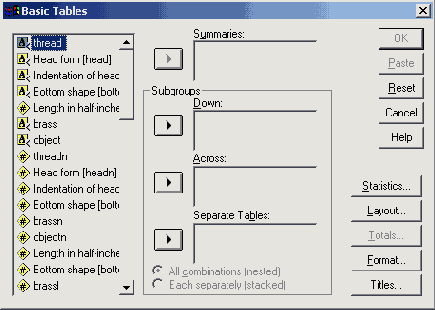 Для этого выберите в меню Analyze (Анализ) Custom Tables (Пользовательские таблицы) Tables of Frequencies... (Таблицы частот)