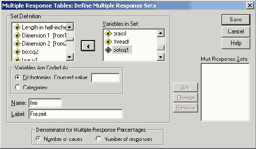 В анкете относительно организации празднования 1-го Мая имеются вопросы с множественными ответами. К примеру возможно несколько вариантов ответов на вопрос: "Как Вы проводите выходные дни?" Здесь опрашиваемый может отметить более одного ответа, например, "Просмотр телепередач" и "Хобби". Для обработки множественных ответов в модуле Tables так же, как и в базовом модуле (см. гл. 12), существует два метода: метод множественных дихотомий и метод множественных категорий.