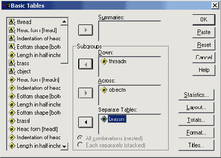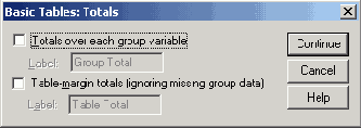 В диалоговом окне Tables of Frequencies (Таблицы частот) Вы можете сгруппировать подгруппы в одну таблицу (см. вышеприведенный пример) или разместить их в разных таблицах. Если вы хотите произвести группировку в разных таблицах, то группирующую переменную необходимо поместить в список Separate Tables (Отдельные таблицы). В первом и во втором вариантах группировки может быть организован вывод процентных показателей и суммарных значений.