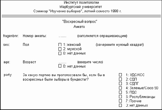 В этой главе мы на небольшом примере опишем процесс подготовки данных. За основу мы возьмем вымышленный опрос — так называемый "воскресный вопрос", который студенты, изучающие политологию в Марбургском университете, задавали избирателям: