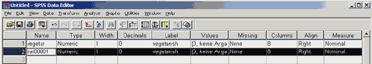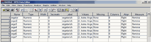 Диалоговое окно Paste Variables (см. рис. 3.12) дает возможность указать количество новых переменных. Если задать здесь число 6, параметры объявления переменной vegetar можно будет перенести на все остальные переменные за одну операцию. В этом случает таблица будет выглядеть так: