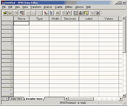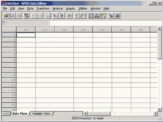 Сейчас с помощью редактора данных мы создадим файл данных. Редактор данных это приложение, напоминающее электронную таблицу. Под электронной таблицей подразумевается рабочий лист, разделенный на строки и столбцы, который позволяет про сто и эффективно вводить данные. Отдельные строки таблицы соответствуют отдельным наблюдениям. Например, при обработке данных опроса одна строка содержит данные одного респондента. Отдельные столбцы соответствуют отдельным переменным. При обработке данных наблюдений анкеты в одной переменной хранятся ответы на отдельный вопрос. Отдельные ячейки таблицы содержат значения переменных для каждого отдельного наблюдения; в каждой ячейке хранится одно значение переменной.