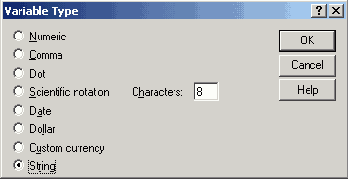 Переменные — это ячейки памяти, в которые можно записывать значения, введенные с клавиатуры. Мы выбрали для переменной имя sex, так как имена переменных в SPSS для Windows могут содержать до восьми символов. Другое, более подробное имя было бы слишком длинным. Имена переменных могут состоять из букв латинского алфавита, цифр и специальных символов; причем первым символом имени должна быть буква.