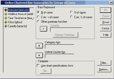 В поле Category Axis: (Ось категорий) введите переменную zweck. В группе Bars Represent (Значения столбцов) поставьте маркер рядом с опцией варианта выбора Sums of variable: (Суммы переменных) и переведите переменную dm в появившееся поле. Отображение совокупной (кумулятивной) кривой устанавливается по умолчанию.