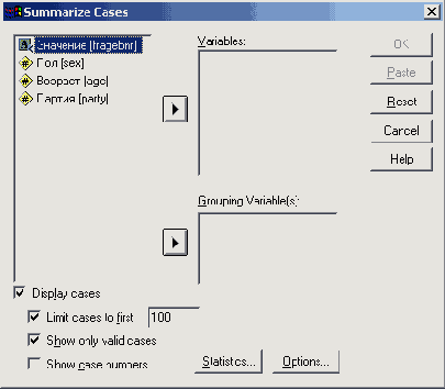 Диалоговое окно Summarize Cases