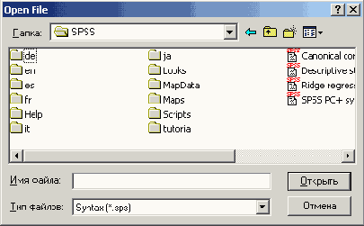 После запуска SPSS for Windows выберите в меню File (Файл) Open (Открыть) Syntax... (Синтаксис) Откроется диалоговое окно Open File (Открыть файл).
