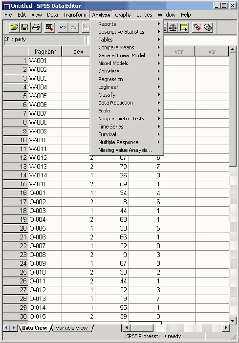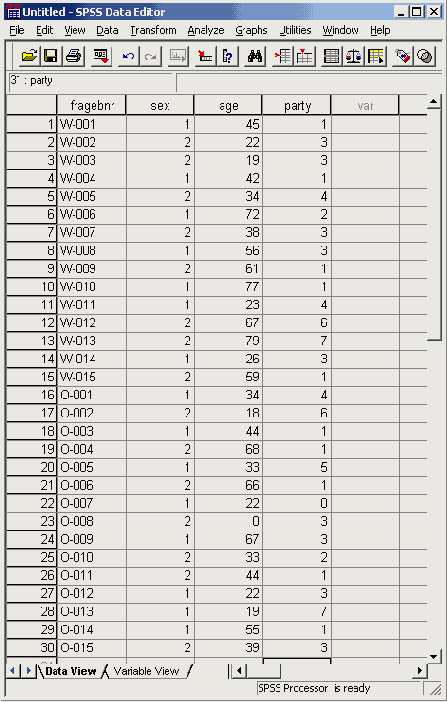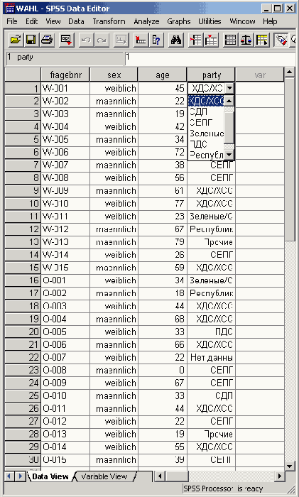 Выберите в меню команды Window (Окно) 1 Wahl.sav — SPSS Data Editor или щелкните на панели инструментов на символе редактора данных
