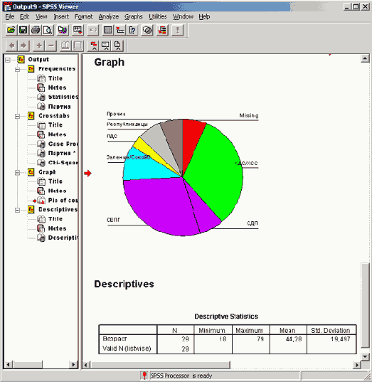 Окно просмотра разделено на две части. В левой отображается структура вывода, а в правой — собственно выводимые данные. В разделе вывода отображаются как таблицы, так и графики. Подробное описание окна просмотра и возможностей, которое оно предоставляет, приводится в разделе 4.5.