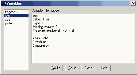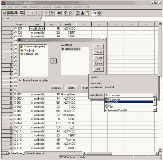 Некоторую информацию о переменной можно также получить и в любой момент, находясь в диалоговом окне какой-либо статистической процедуры. Для изучения этой операции рассмотрим следующий пример. Допустим, Вы исследуете частотное распределение переменной partei (партия).