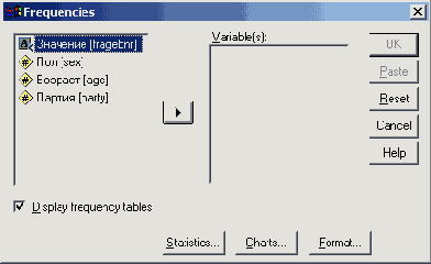 В диалоговом окне Frequencies (Частоты) перенесите переменную partei (партия) в поле целевых переменных.