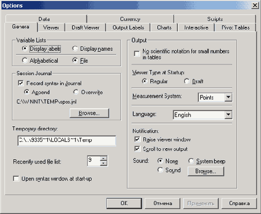 General (Общие): здесь вы можете задать тип сортировки списков переменных. Сортировка в алфавитном порядке, установленная по умолчанию, может быть изменена на порядок, в котором переменные были расположены в рабочем файле. Вы можете также задать, что указывать во всех диалоговых окнах — метки значений или имена переменных.