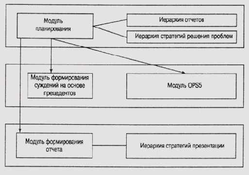 - Модуль формирования суждений на основе прецедентов и модуль продукционной системы (в действительности эту функцию выполняет модуль OPS5) выполняют логический вывод в предметной области, опираясь на соответствующие базы знаний.