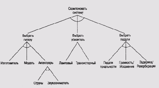 Анализ задачи. Используйте тот же вид анализа задачи, который мы применяли в отношении системы R1, т.е. разложение задачи на подзадачи. Отправной точкой может послужить И/ИЛИ-дерево, приведенное на рис. 14.2. Постарайтесь либо построить систему на определенную глубину дерева, либо сделать ее более специализированной, "разрисовав" подробнее одно из поддеревьев, выбор усилителя или гитары.