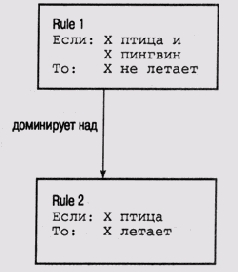 Основная эвристика специфики состоит в следующем. Если существуют два конфликтующих правила Rule 1 и Rule 2 и условия, специфицированные в правиле Rule 2, являются подмножеством условий, специфицированных в правиле Rule 1, то правилу Rule 1 дается более высокий приоритет, чем правилу Rule 2. Можно и по-другому рассматривать эту эвристику. Правило Rule 2 является более "общим", чем правило Rule 1, и оно обрабатывает по умолчанию те случаи, которые не "охватываются" более специализированным правилом Rule 1. При этом фактически правило Rule 1 имеет дело с исключениями из общего правила Rule 2, поскольку в нем принимаются во внимание дополнительные условия (рис. 14.1).