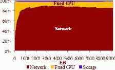 Если взглянуть на первый столбец (пропускная способность), то становится ясно, что только S3 и Azure смогли справиться с высокой рабочей нагрузкой в 9000 EB. Для всех других вариантов при росте числа EB узким местом становится сервер баз данных. Мы полагаем, что вариант S3 с архитектурой распределенного управления способен масштабироваться за пределами 9000 EB. Это единственная архитектура без потенциальных узких мест. Поскольку служба Azure основана на архитектуре репликации (подраздел 3.3), она исчерпывает свои возможности масштабирования, когда мастер-сервер баз данных становится перегруженным. Однако, как кажется, Microsoft использует для поддержки уровня баз данных SQL Azure высокопроизводительные машины, так что при наличии 9000 EB предел возможностей этой службы достигнут не был.