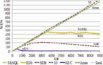Для вариантов SimpleDB, S3 и Google AppEngine (с кэшированием и без кэширования) мы измеряли WIPS для ряда значений числа EB (EB=1, 250, 500, 1000, 2000, 3000, 4000 и 9000, если это оказывалось возможным) в течение 10 минут. Для этих вариантов мы не могли выполнить измерения для всего спектра значений числа EB из-за ограниченного бюджета. Для трех вариантов, основанных на MySQL (MySQL, MySQL/R и RDS), и варианта Azure мы проводили измерения для всех значений числа EB в диапазоне от EB=1 до EB=9000. Для этого мы начинали работу при EB=1 и затем увеличивали рабочую нагрузку, добавляя по одному EB через каждые 0,4 секунды. Во всех случаях перед каждым экспериментальным прогоном тестового набора мы выполняли "разогревающий" (warm-up) двухминутный прогон; стоимость и пропускная способность этой двухминутной разогревающей фазы не учитываются в результатах, представленных в этой статье.