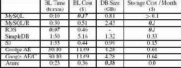 Для полноты в табл. 6 для всех альтернативных вариантов показано время и стоимость массовой загрузки, а также размер базы данных и месячная стоимость ее хранения. Как и раньше, выигрышные результаты выделены полужирным шрифтом и курсивом. Во всех случаях для массовой загрузки базы данных использовались наилучшие доступные средства. В случае MySQL данные заносились через JDBC-подключение. В случае SimpleDB мы использовали операцию пакетной вставки (batch-put), которая сохраняет сразу 25 записей. Для S3 отсутствует какая-либо особая поддержка массовой загрузки, так что данные загружались с использованием стандартного протокола, описанного в [3]. В случае Google AE для применения средства Google для пакетного импорта данных мы использовали скрипт на языке Python. В случае Azure использовался SQL Azure Migration Wizard. В целом, в этой категории явным образом победила система MySQL. Для MySQL/R стоимость и время загрузки в точности в три раза превышали эти показатели для MySQL, поскольку для MySQL/R мы использовали коэффициент репликации, равный трем.