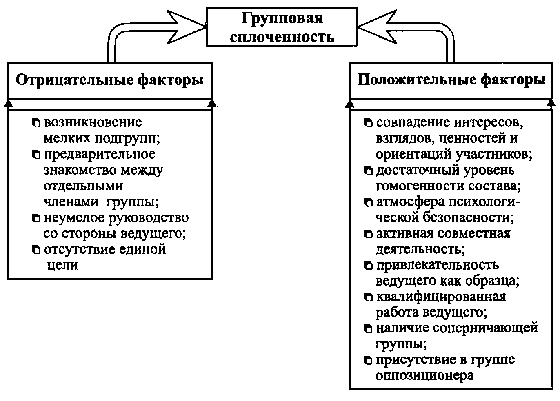 Негативные и позитивные факторы, оказывающие влияние на уровень групповой сплоченности, обобщенно отражены на рисунке 3.