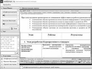 проводить видеоконференции с большим количеством участников, включающие изображения с веб-камер, чат, голосования, опросы, показ слайдов, обмен файлами, модерирование (возможность управлять последовательностью выступлений);