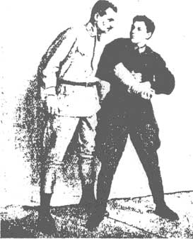 Второй способ загиба руки за спину очень редко может удасться первым приемом в тренировке, но он особенно ценен при невозможности довести загиб руки за спину первым способом, когда противник зашел влево или захвативший уклонился вправо (в этом случае прием продолжать дальше невозможно). (Рис. 57). Тогда необходимо быстро перенести правую руку к кисти противника и поднырнуть под нее, т.е. начатый загиб руки за спину первым способом - приходится доканчивать вторым способом. (См. рис.