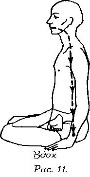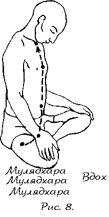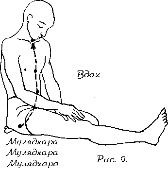 2. Может быть и такое, что сначала вы сможете проделать только один полный круг вдоха и выдоха и вслед за этим почувствуете дискомфорт. В этом случае мы рекомендуем вам совершить одно дыхательное движение (то есть вдох и выдох) «впустую», но только тогда, когда ваше сознание достигнет мулядхары. С течением времени, когда у вас выработается привычка, а протяженность вдоха, задержки и выдоха увеличится, дополнительный вдох и выдох больше не понадобятся.