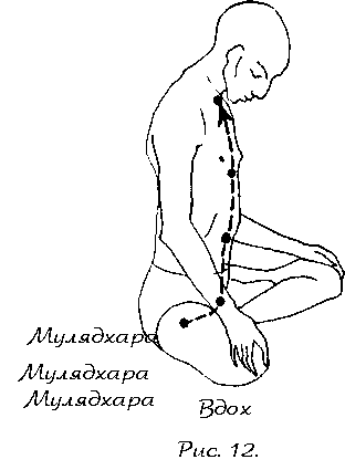 Ментально произнесите мантру: «мулядхара, мулядхара, мулядхара». Когда вы начнете вдыхать с помощью удджайи пранаямы, позвольте вашему сознанию, подниматься по фронтальному каналу арохан. Осознанно проходите следующие центры один за другим: свадхистхана, манипура, анахата, вишудхи. Должен быть только мягкий ток сознания ( № 13). Никакого ментального произнесения чакр.