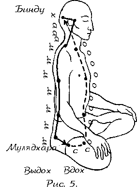 ДЫХАНИЕ И ПСИХИЧЕСКИЕ КАНАЛЫ ТОКОВ ПСИХИЧЕСКОЙ ЭНЕРГИИ Еще раз повторим, что во время практики крии следует практиковать удджайи пранаяму. Энергия вдоха направляется к манипуре, а оттуда к вишудха чакре. Затем следует задержать дыхание на несколько секунд в вишудхе. Выдох надлежит делать по психическому каналу, проходящему от вишудхи через позвоночник к аджне, а затем прямо к бинду, а после к сахасраре на макушке головы. Дыхание должно быть синхронизировано с потоком праны (или амриты) через посредство психических каналов.