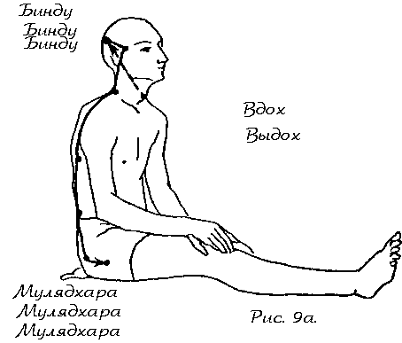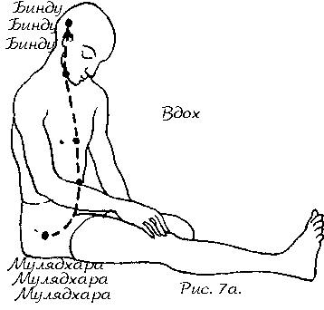 В то же время начните двигать свое внимание по каналу аварохан в направлений следующих центров: бинду, аджна, вишудхи, анахата, манипура, свадхистхана, мулядхара. Осознайте прохождение каждого центра ( № 12д). Но не называйте его ментально. Выдох должен закончиться в мулядхаре. Задержите дыхание.