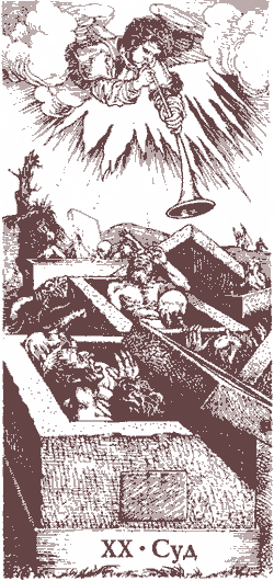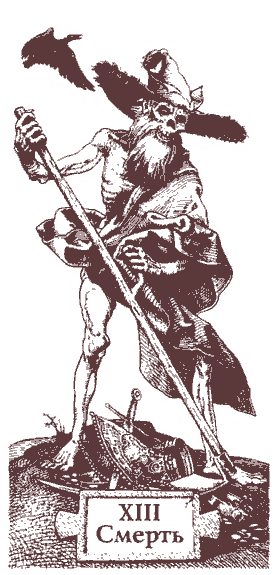 Смерть - тринадцатая карта в колоде Таро, номер несчастливый с древних времен. Карта изображала скелет, угрожающе потрясающий косой и поражающий людей самых разных социальных групп. Эта тема широко разрабатывалась в средние века; достаточно вспомнить большие циклы в живописи, изображающие пляски смерти или трактаты на темы морали в Ars Morendi или тему Апокалипсиса и серию известных гравюр Дюрера.